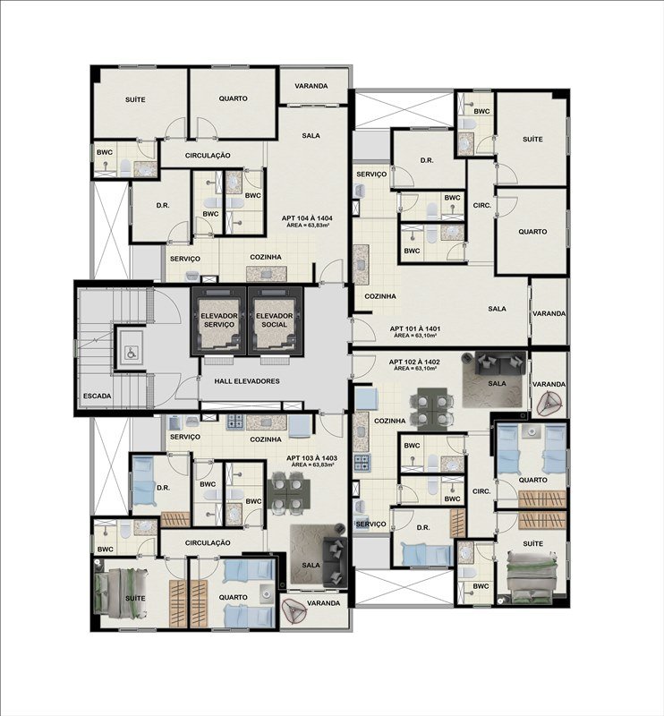 Apartamentos de 3 quartos (sendo 1 suíte), 63,10 ou 63,83m²m². Compostos por varanda, sala para 2 ambientes, cozinha, área de serviço, WC social e WC de serviço,vaga na garagem.