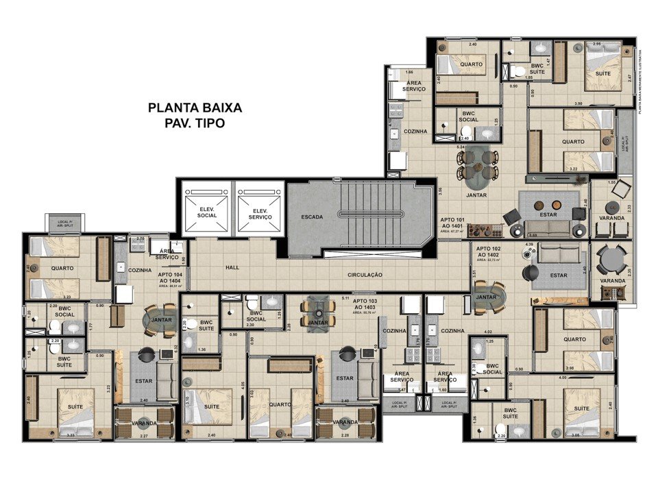 Compostos por varanda, sala para 2 ambientes, cozinha, área de serviço, WC social, espaço para split, e todas as unidades entregues com fechadura digital.