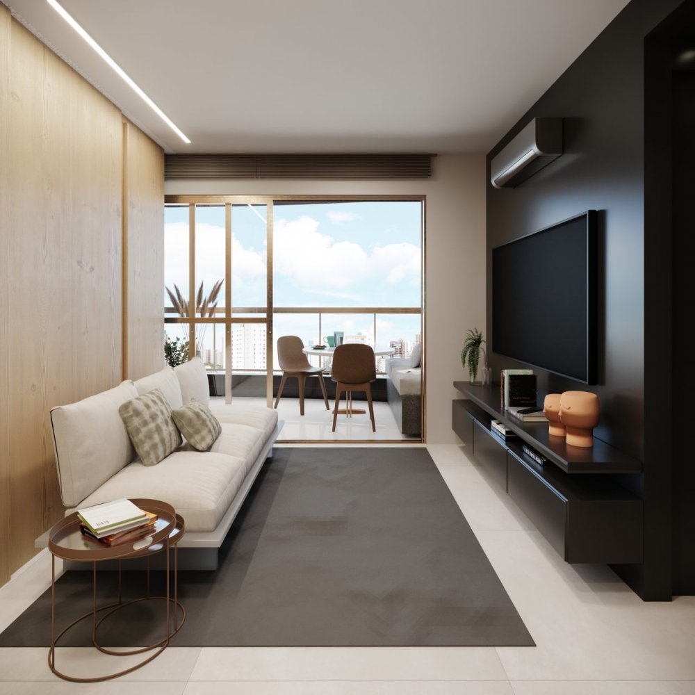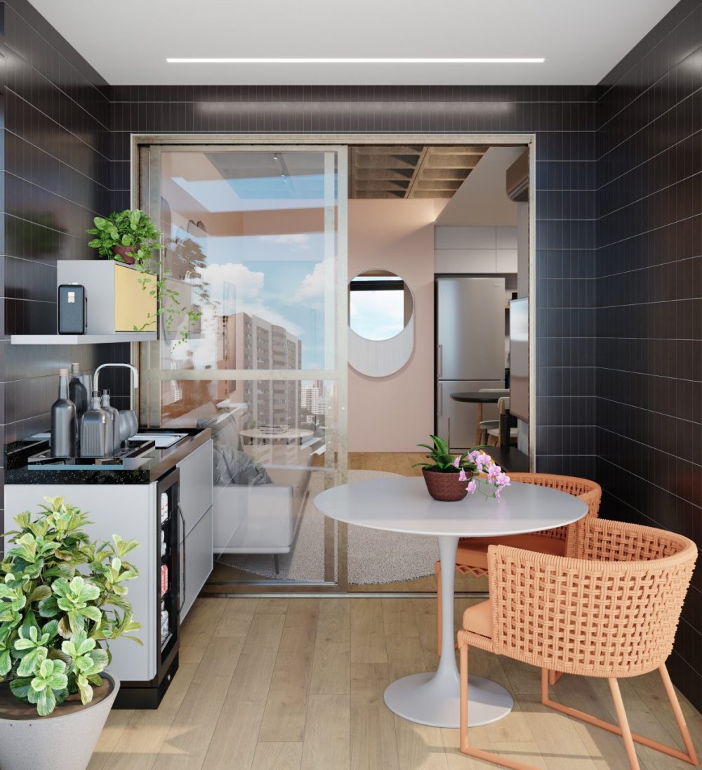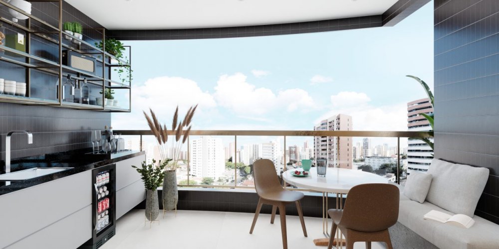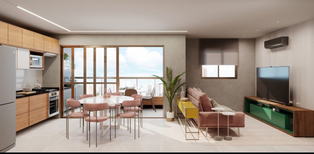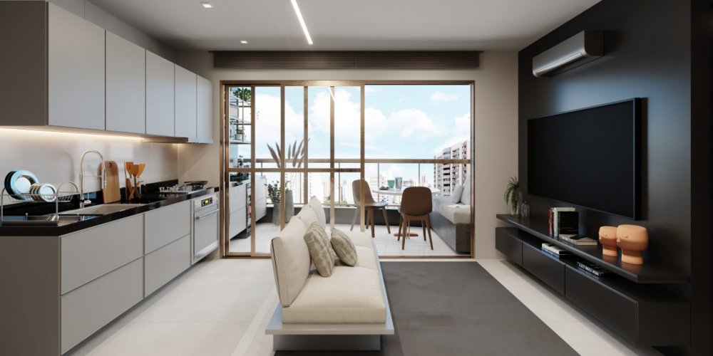 Compostos por varanda gourmet, sala para 2 ambientes, cozinha, área de serviço, WC social, espaço para split, e fechadura digital.