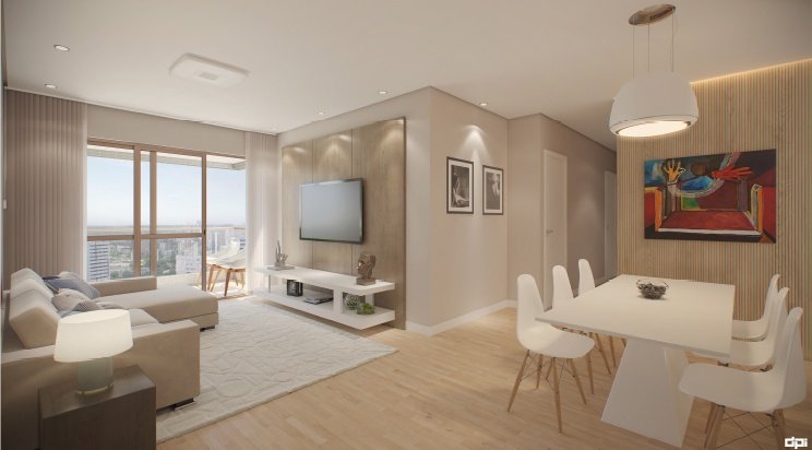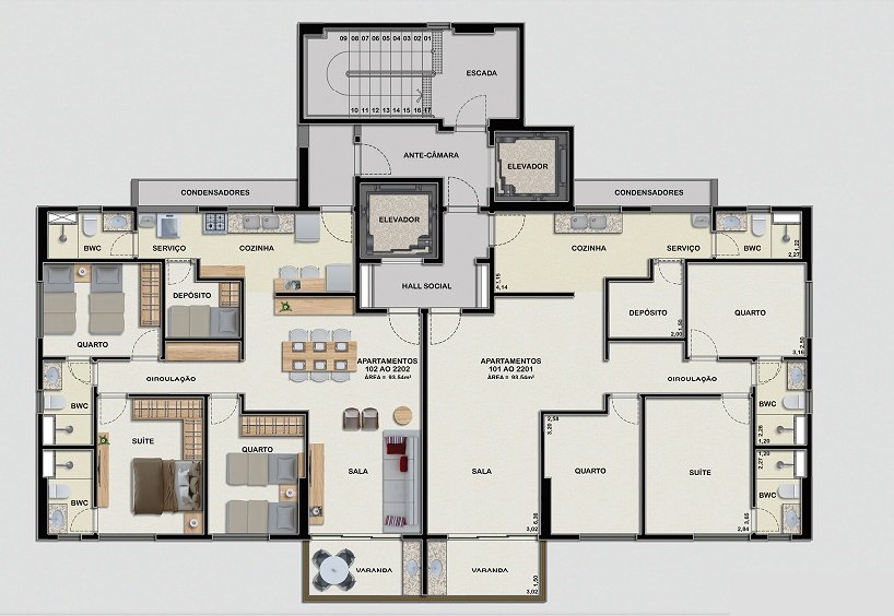 Apartamentos de 3 quartos (sendo 1 suíte), 2 vagas na garagem, varanda gourmet, sala para 2 ambientes, cozinha, área de serviço, WC social, quarto e WC de serviço.