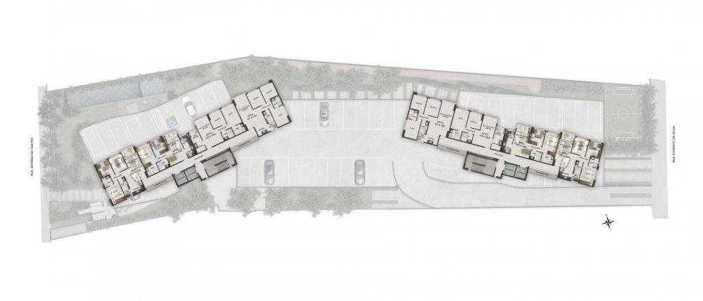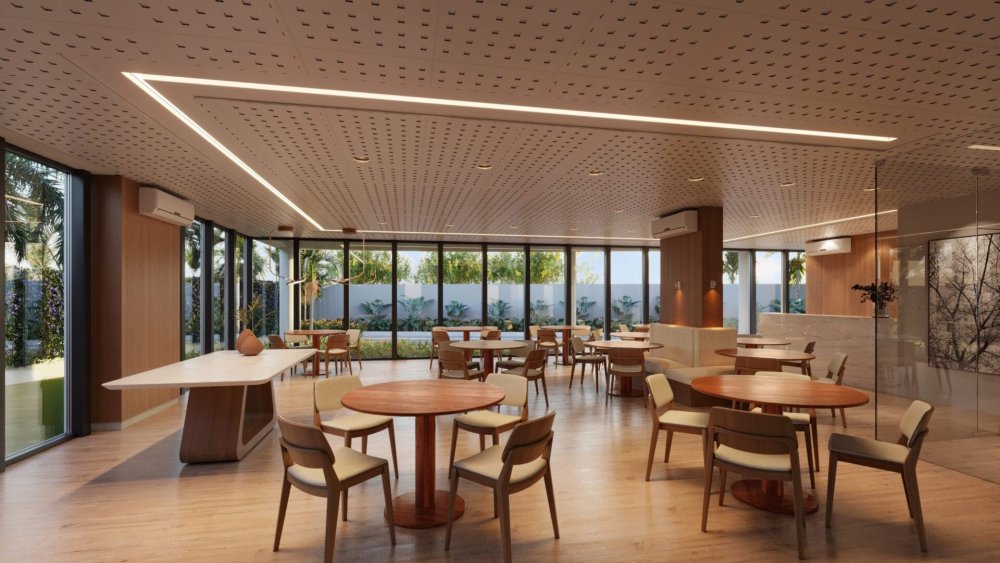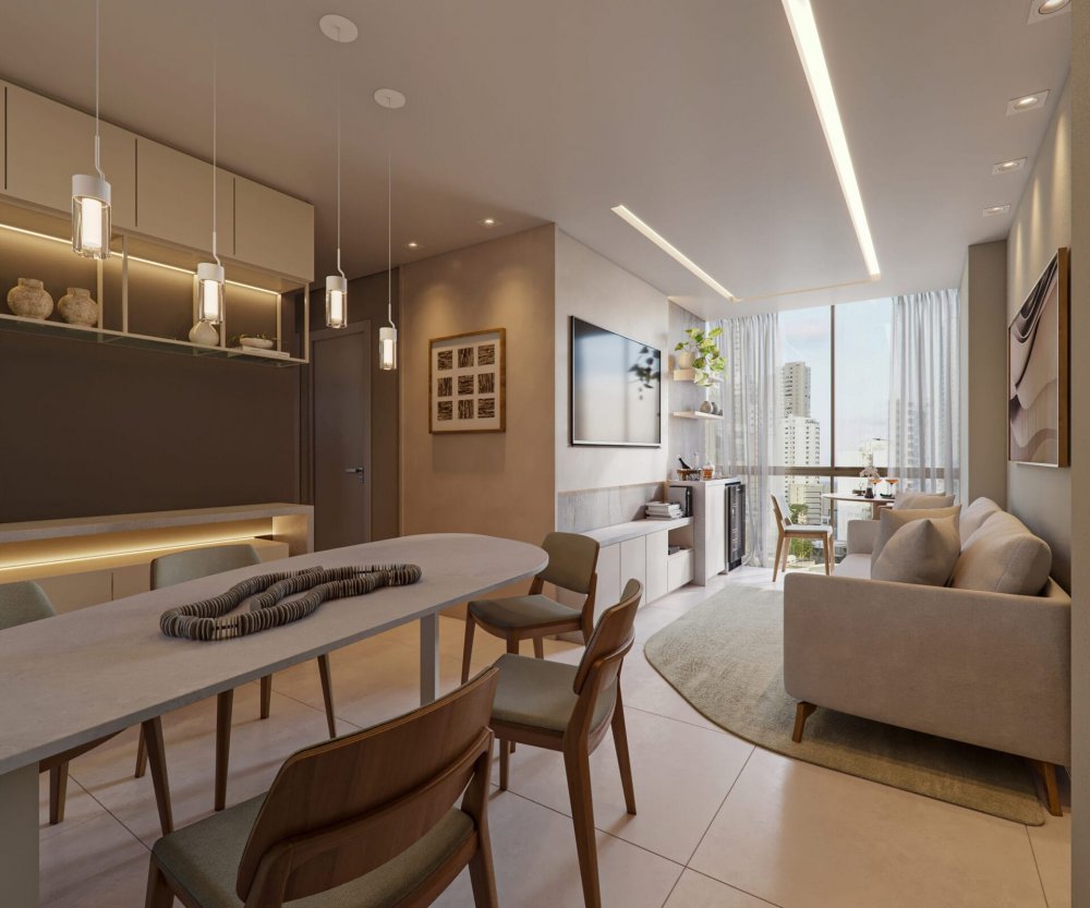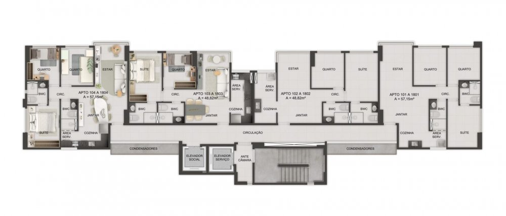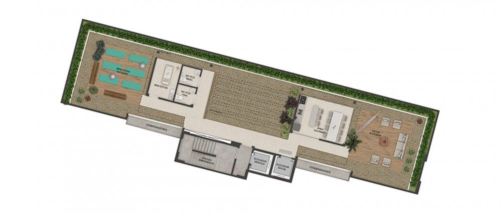 Compostos por varanda, sala para 2 ambientes, cozinha, área de serviço, WC social, espaço para split.