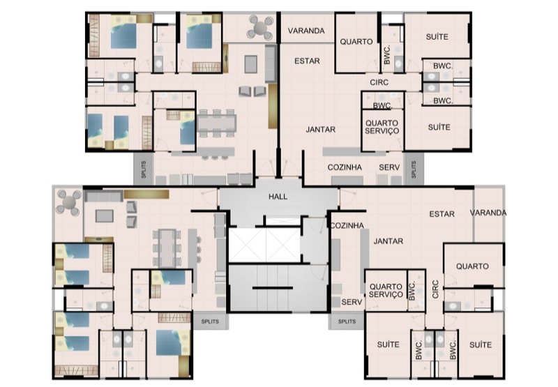 Compostos por varanda, sala para 2 ambientes, cozinha, área de serviço, lavabo, espaço para split, depedência e WC de serviço.