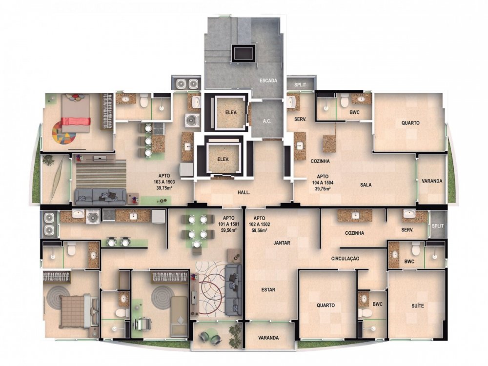 Compostos por varanda, sala para 2 ambientes, cozinha, área de serviço, WC social, espaço para split.
