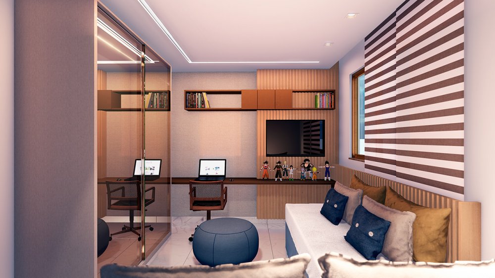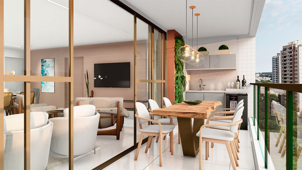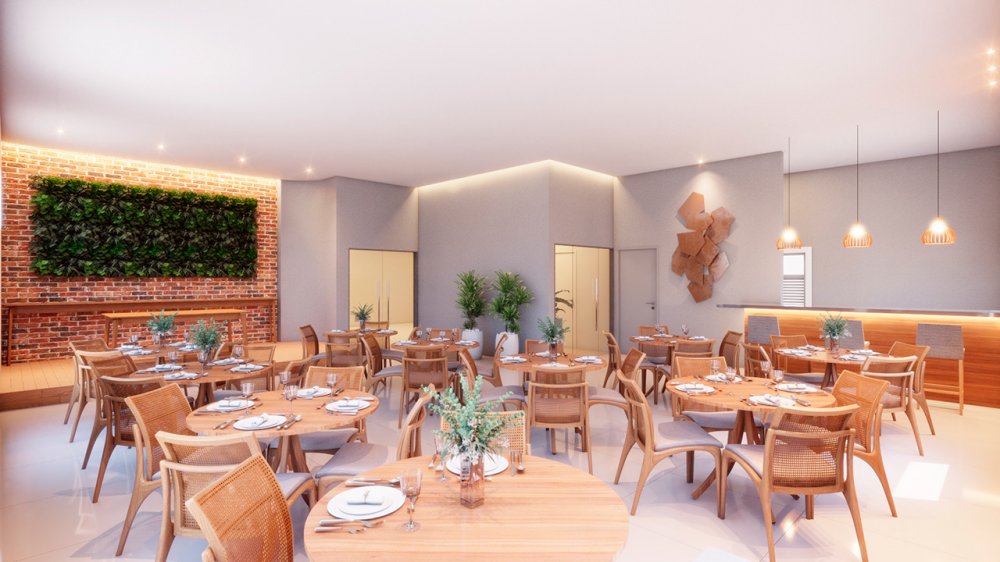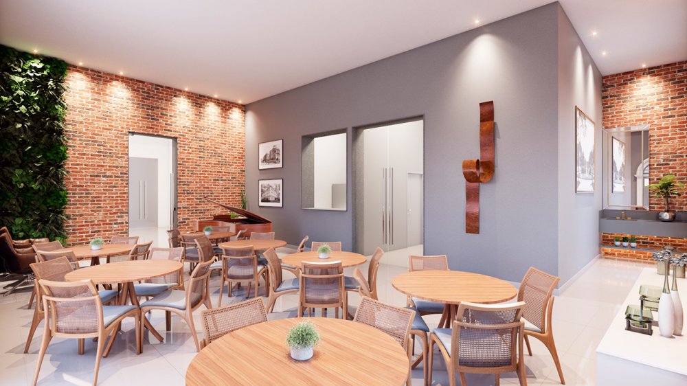 Compostos por varanda gourmet, sala ampla, cozinha, área de serviço, lavabo, depósito e WC de servio, espaço para split, e todas as unidades entregues com piso porcelanato.