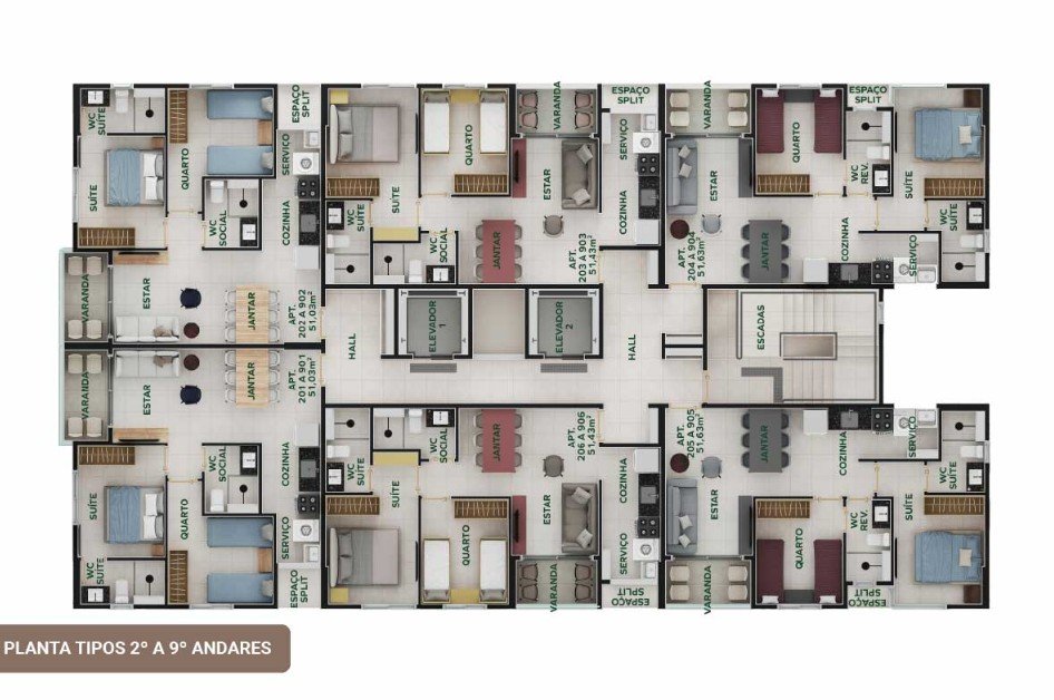 Apartamentos com 3 tipos de plantas, todas com 2 quartos e opção de 1 ou 2 suítes (reversível) e 1 vaga de garagem. Além de varanda, WC social, cozinha, área de serviço, ponto de antena e TV em todos os quartos, e piso em porcelanato.