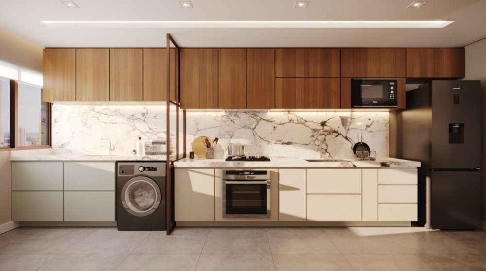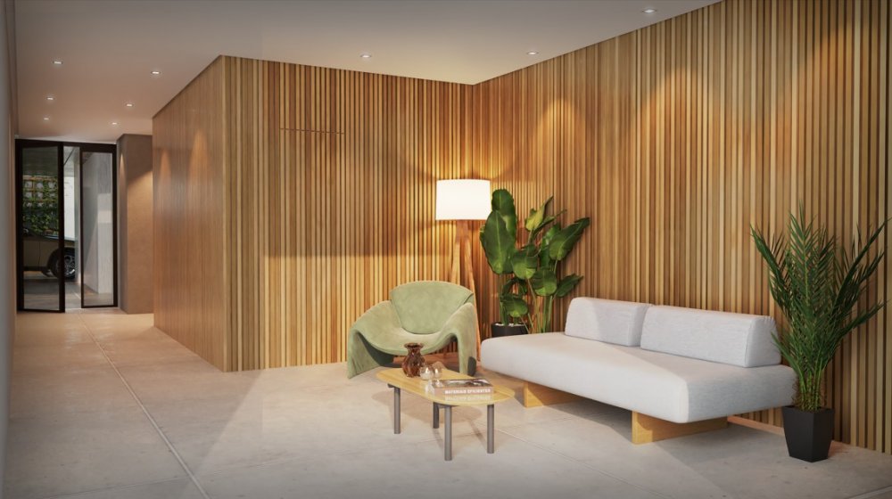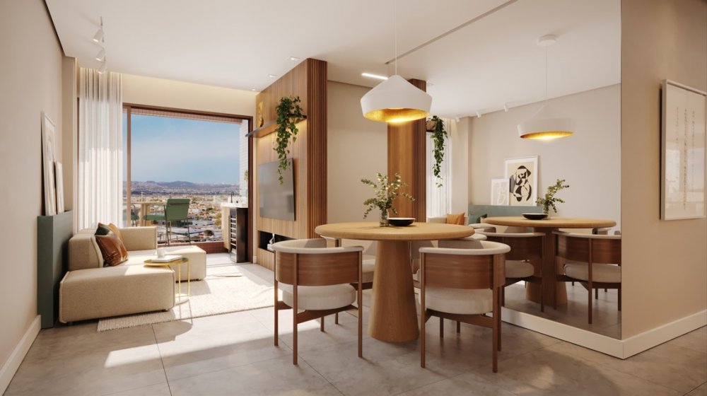 sala para 2 ambientes, WC social, cozinha, área de serviço, 1 ou 2 vagas na garagem.