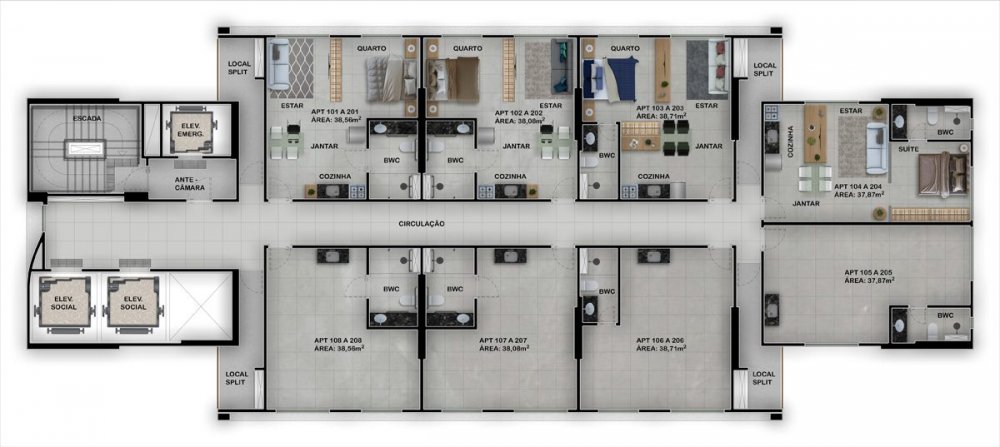 Apartamentos com quarto, sala, banheiro, cozinha. Além de dispor de automação residencial (será entregue Alexa e controle para automação da Alexa ou modelo similar)