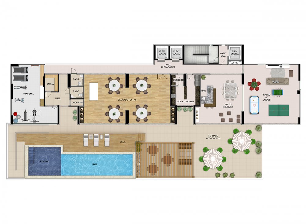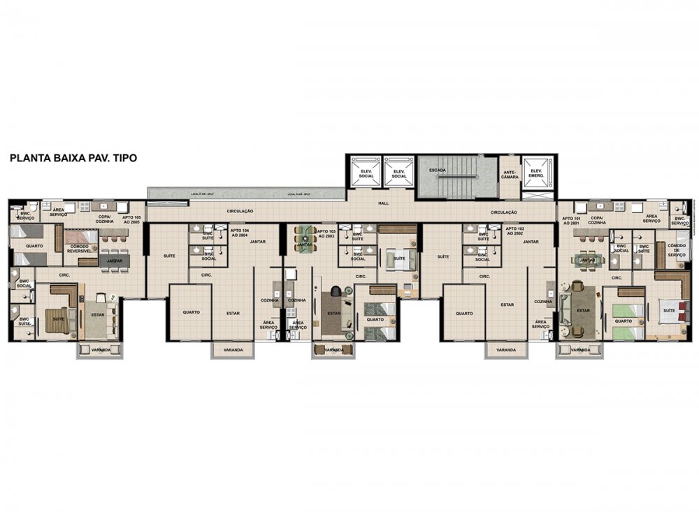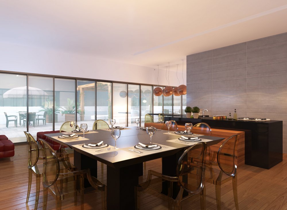 Compostos por varanda, sala para 2 ambientes, cozinha, área de serviço, WC social.