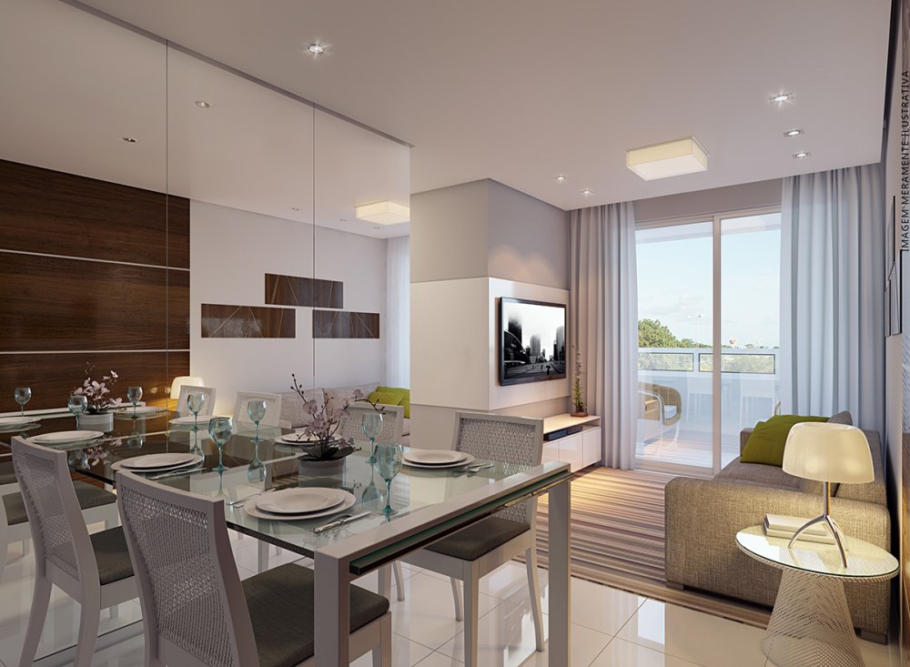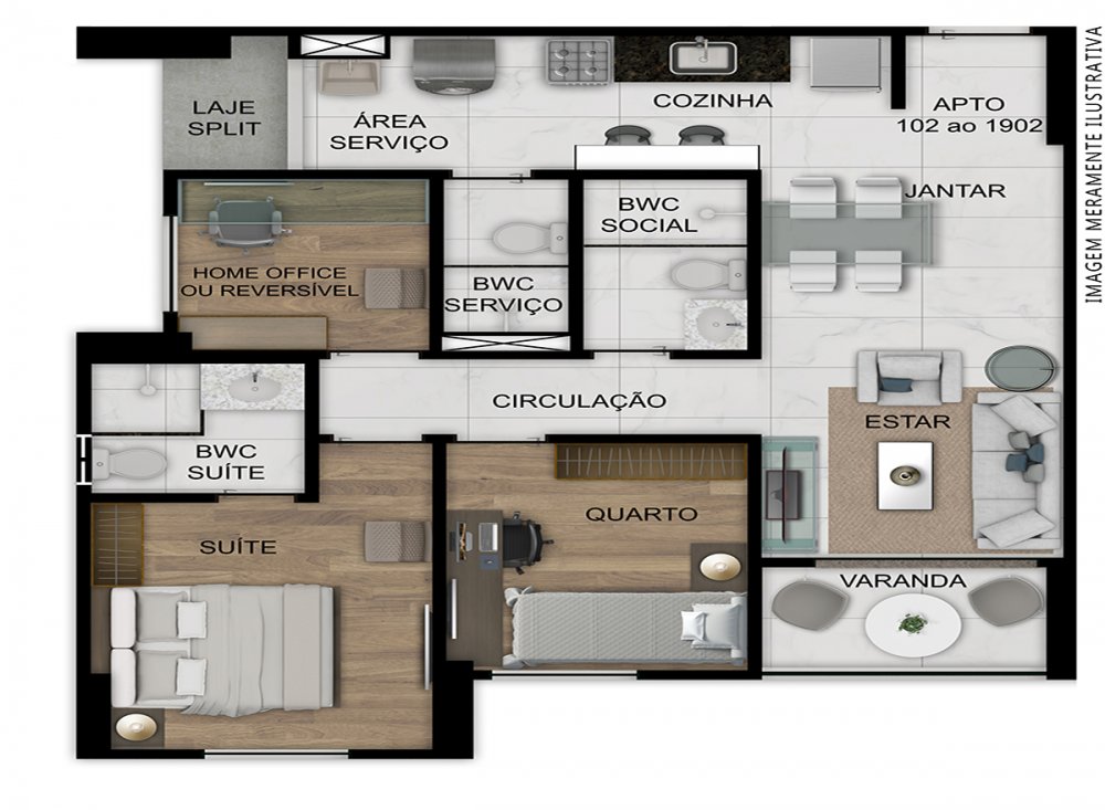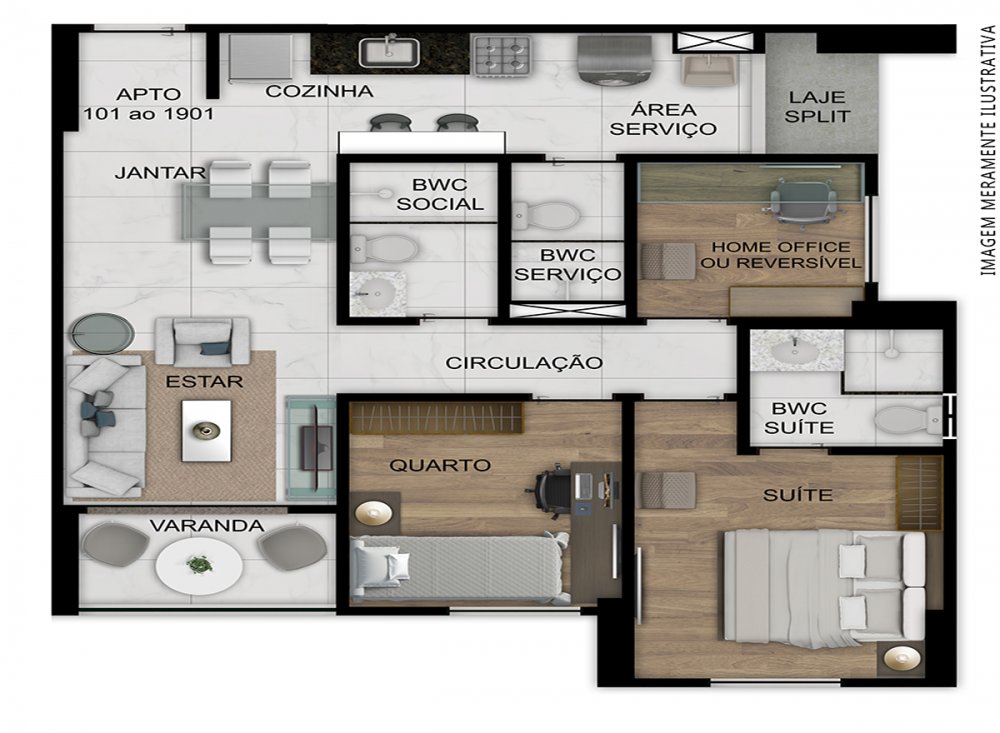 Compostos por varanda, sala para 2 ambientes, cozinha, área de serviço, WC social.